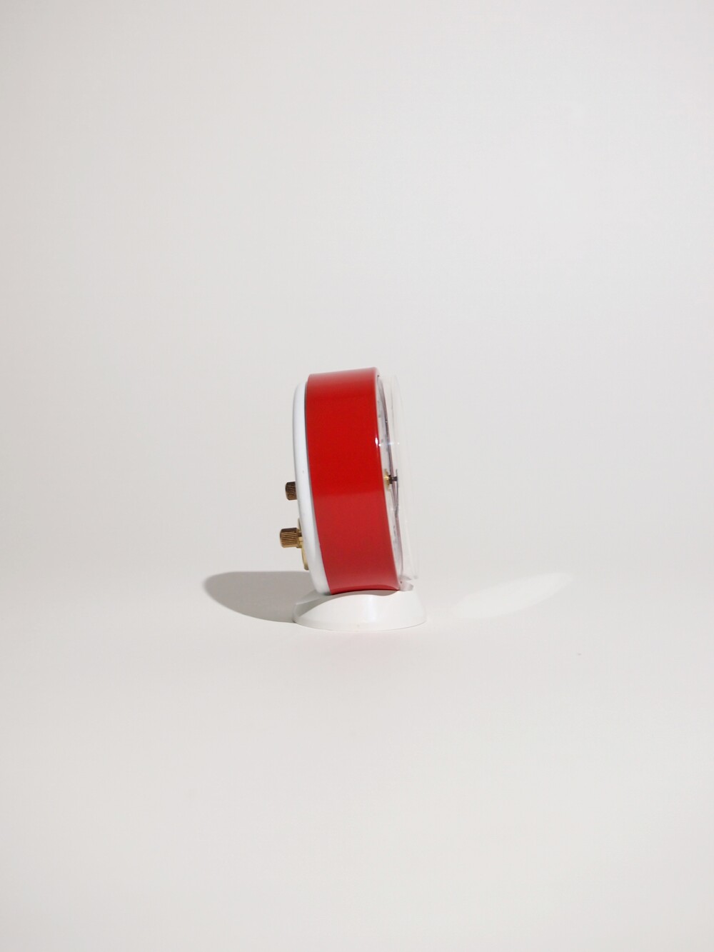 화이트 바탕의 원형 다이얼, 레드 컬러의 케이스와 입체감이 있는 플라스틱 투명 커버로 디자인되어 있으며 태엽을 감아 사용하는 방식으로 최대로 감았을 경우 24~30시간을 유지합니다.