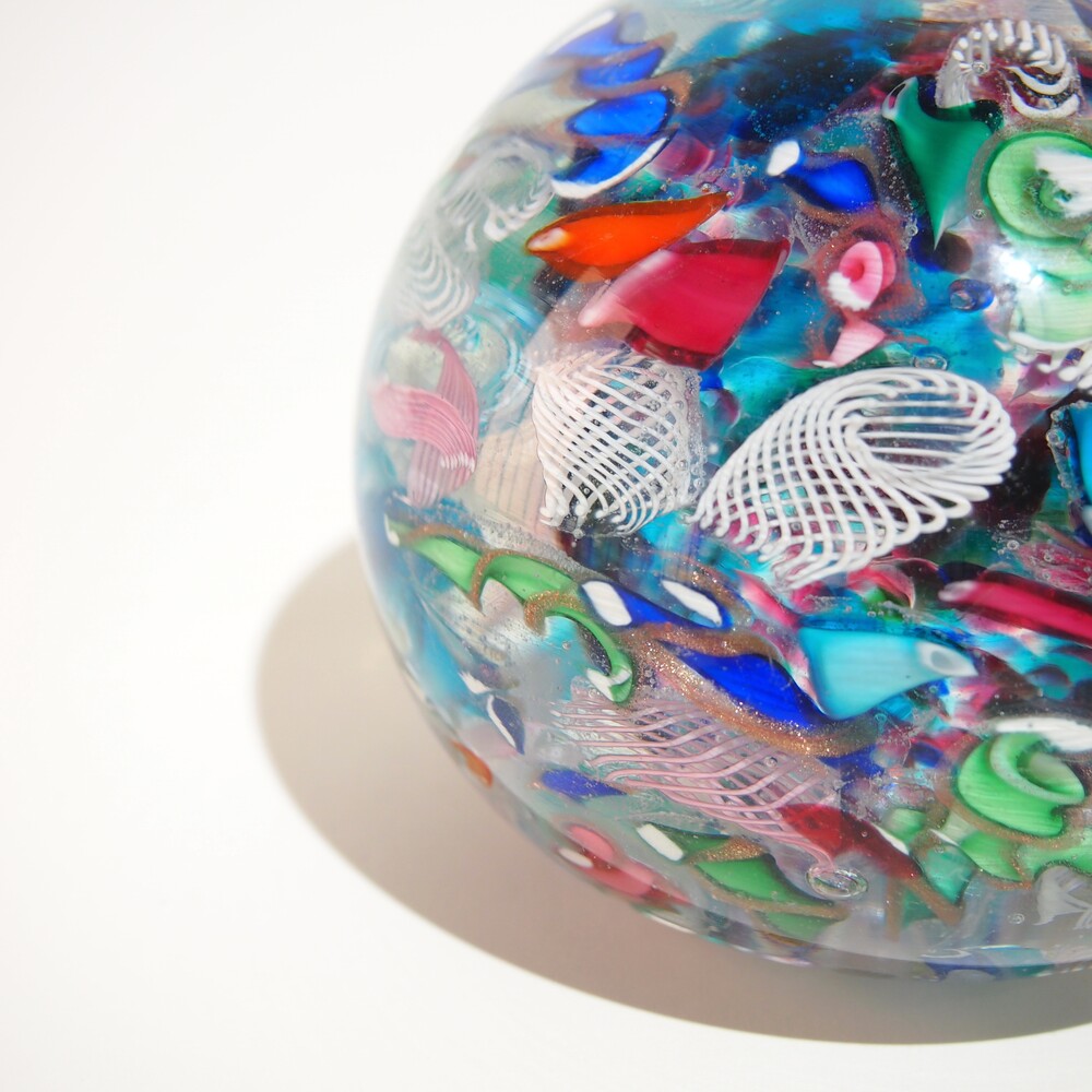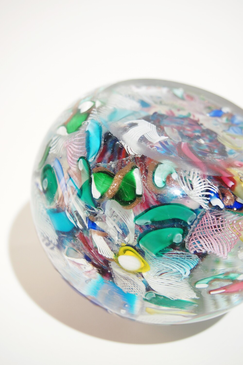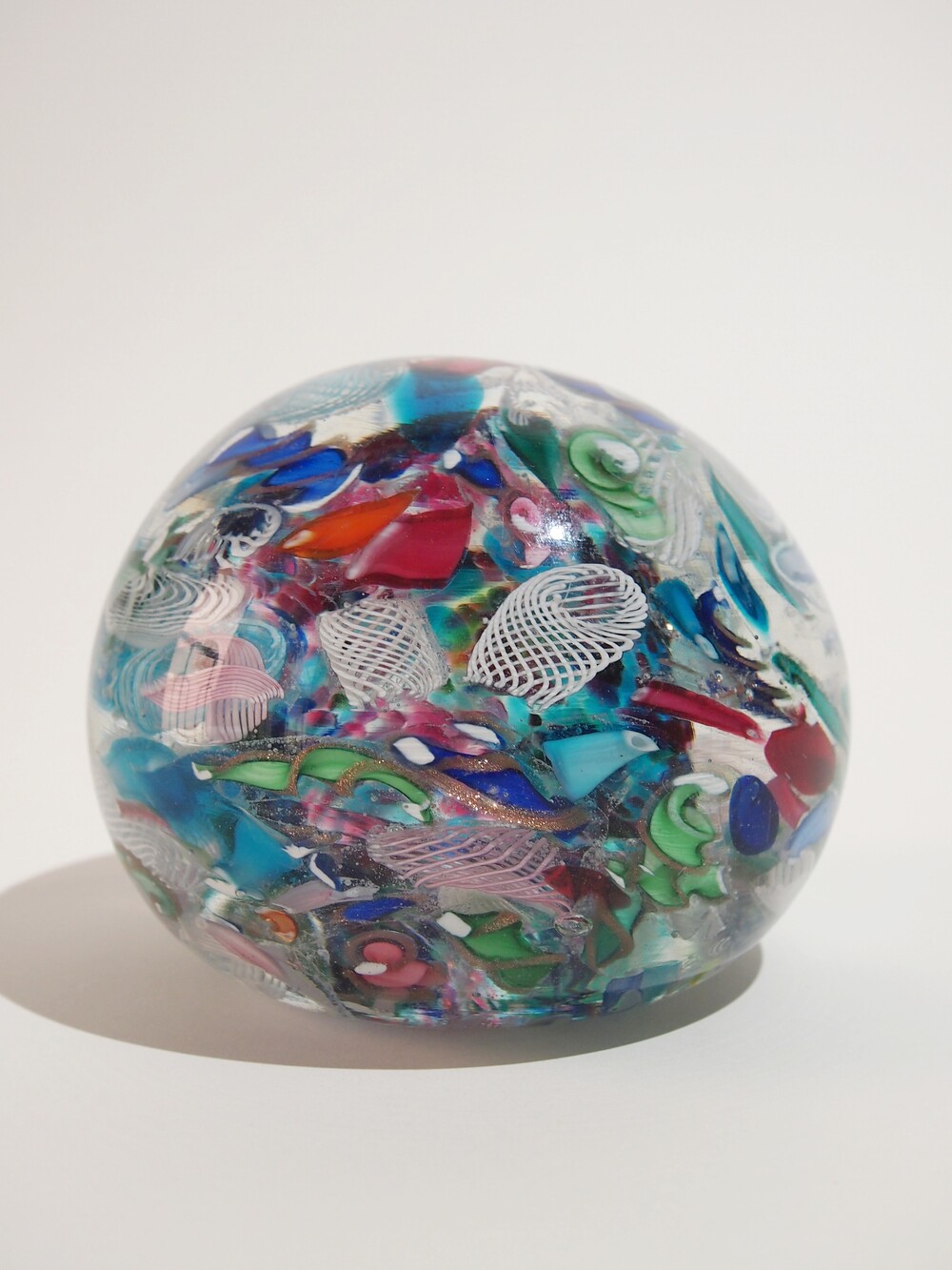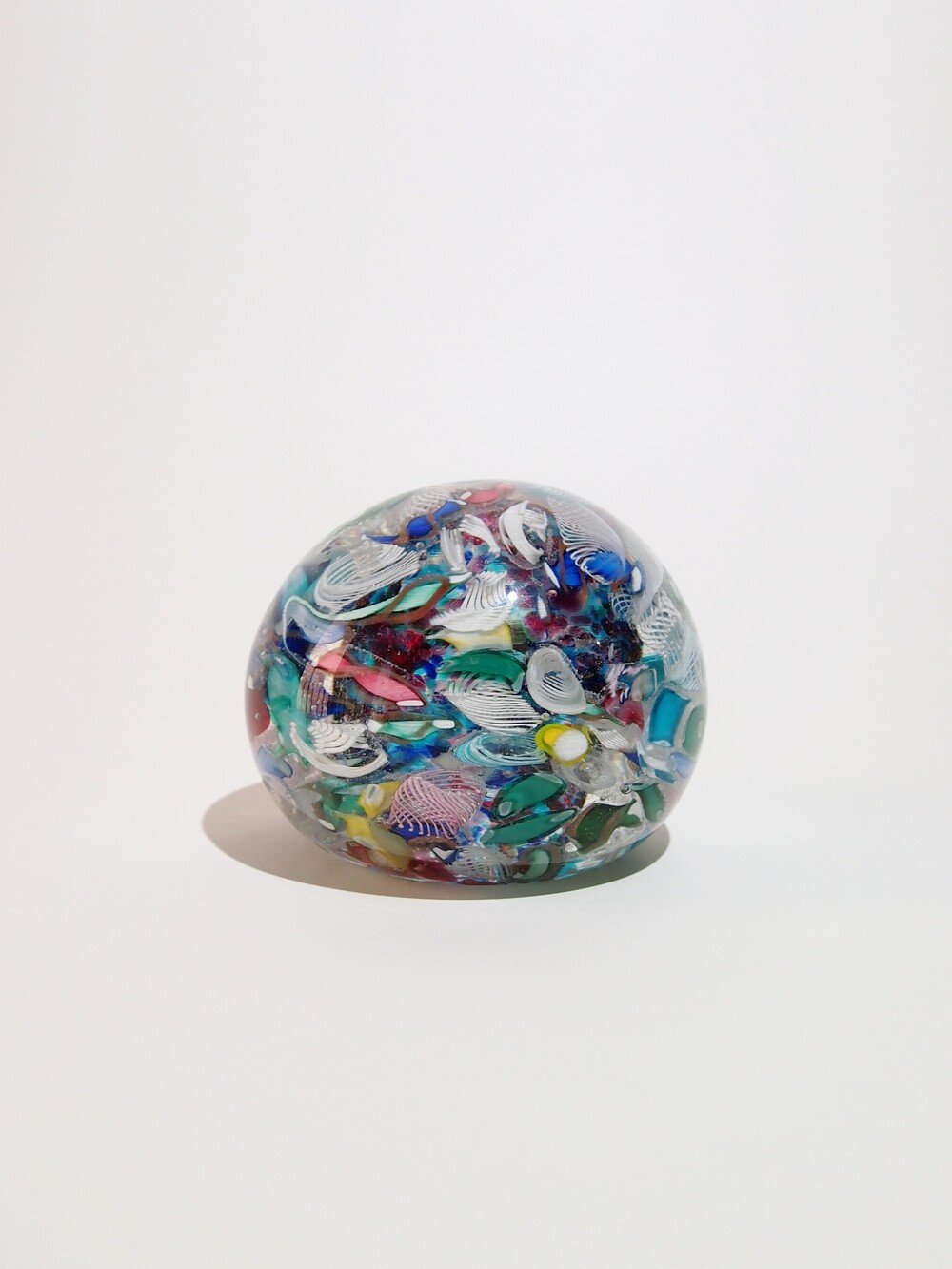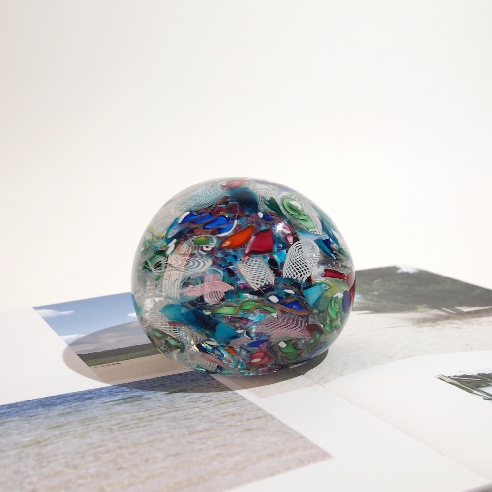 투명한 유리 안에 다양한 색상과 패턴의 조각들이 채워져있는 디자인으로 당시의 무라노 장인들의 감각과 스킬을 단적으로 볼 수 있는 유리 문진입니다.