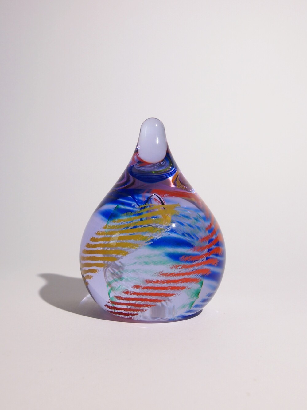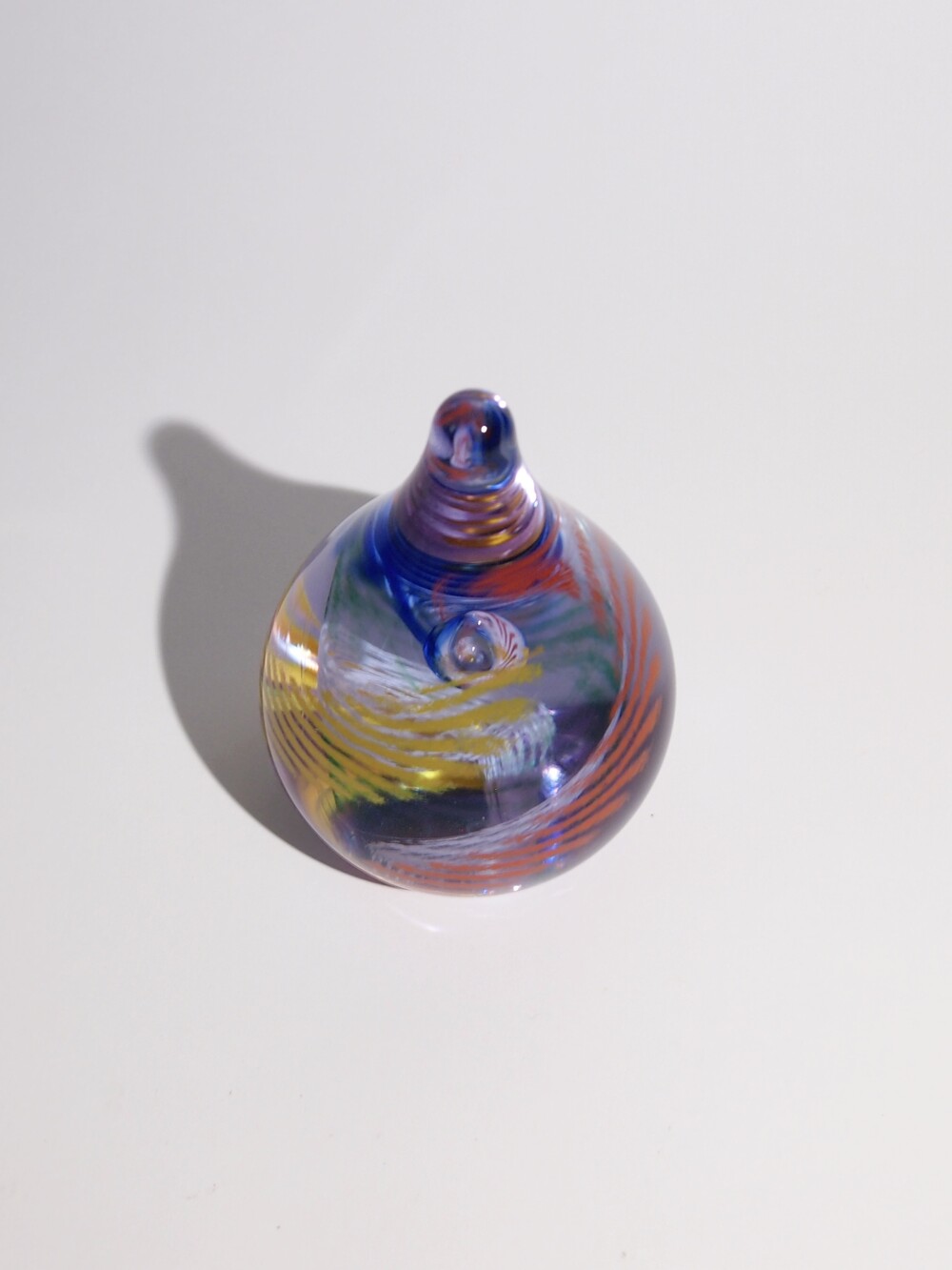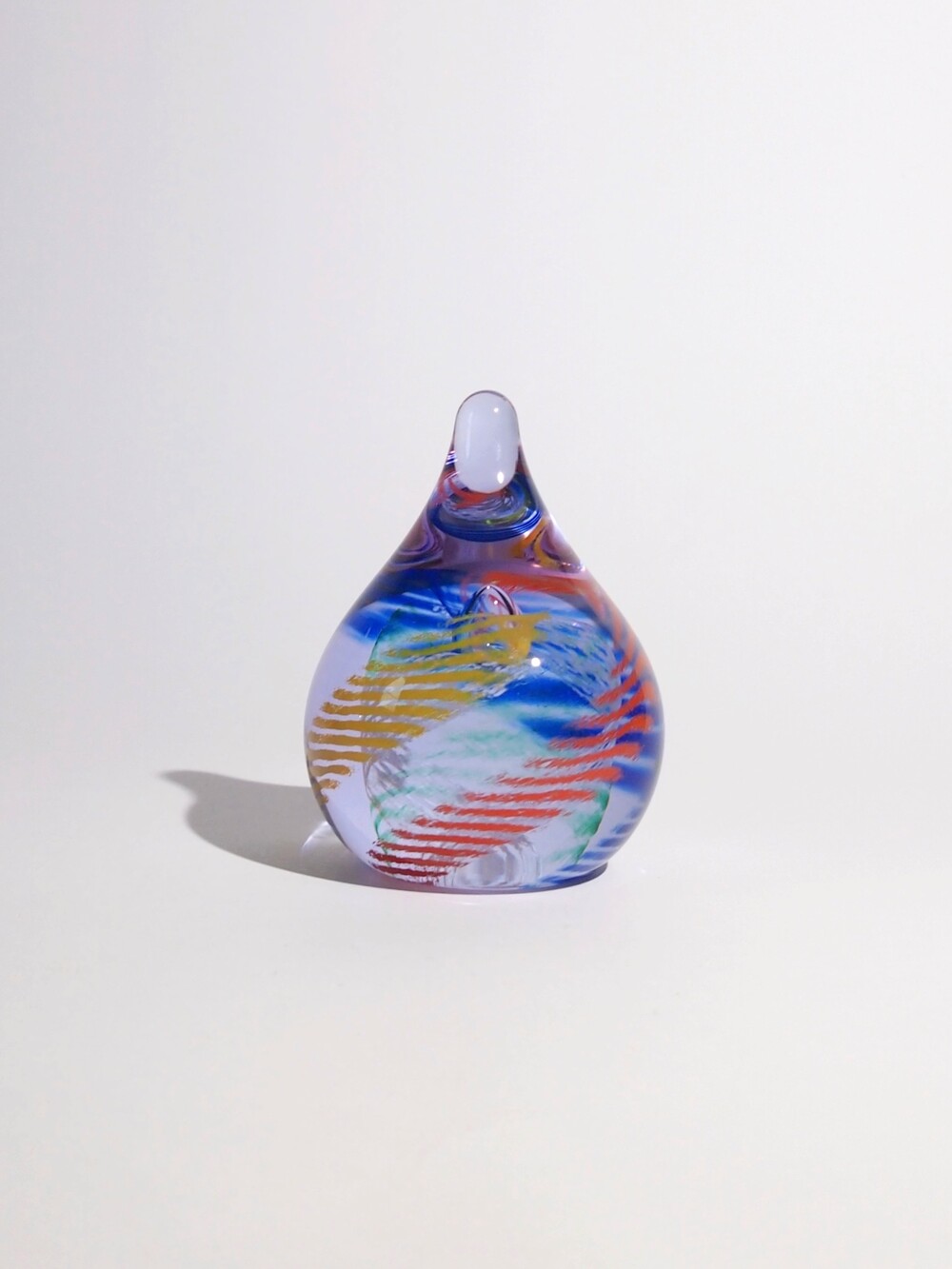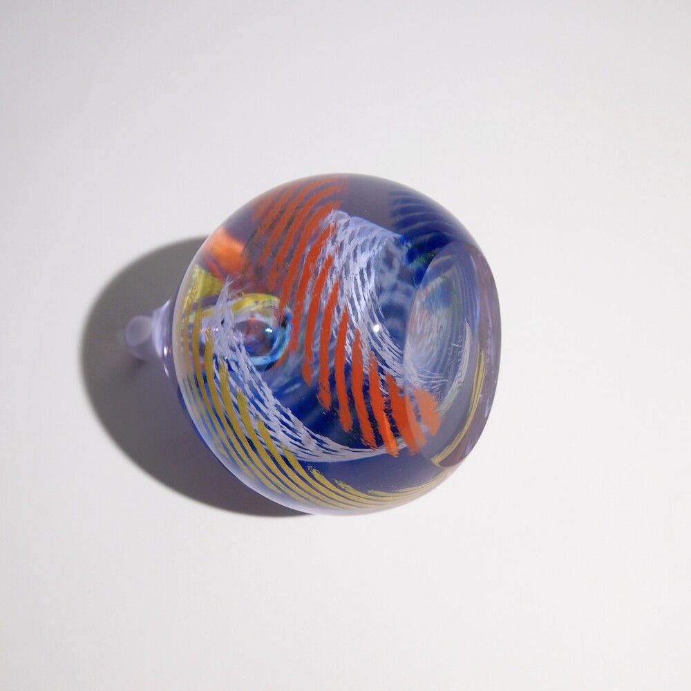 투명한 유리 안에 작은 물방울 기포를 불어넣고 그 기포를 중심으로 크레파스로 그린 듯한 색상들이 기하학적으로 소용돌이치며 퍼져나가는 형상입니다.