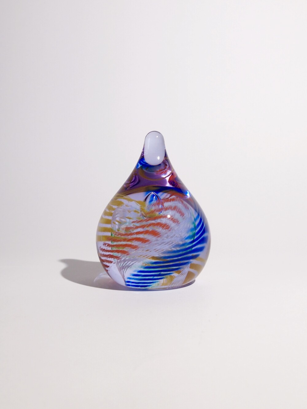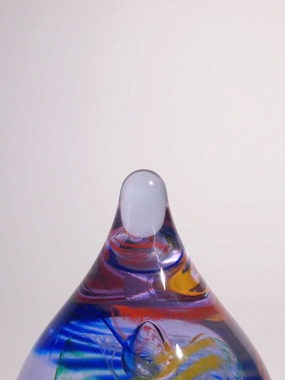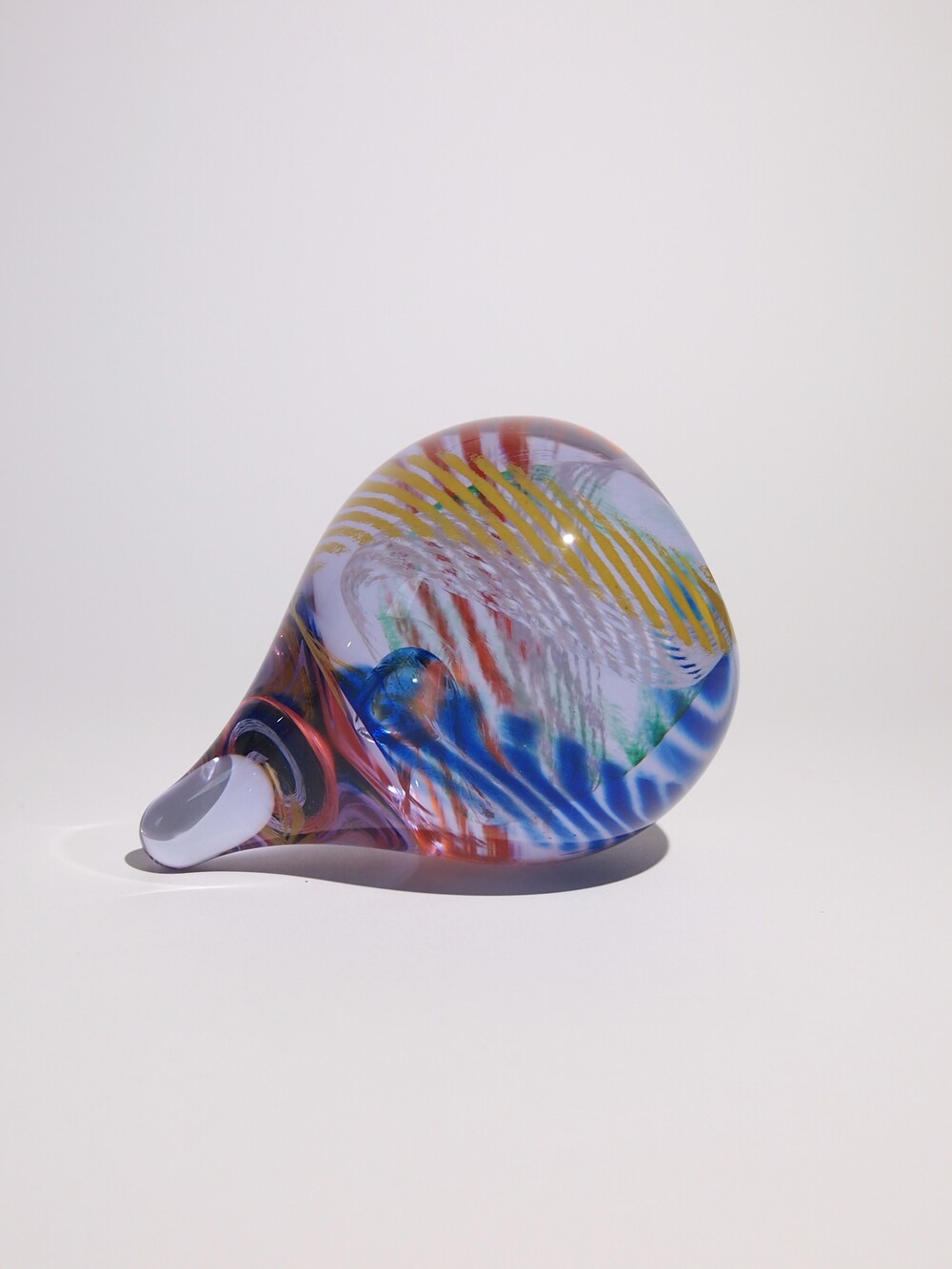 투명한 유리 안에 작은 물방울 기포를 불어넣고 그 기포를 중심으로 크레파스로 그린 듯한 색상들이 기하학적으로 소용돌이치며 퍼져나가는 형상입니다.