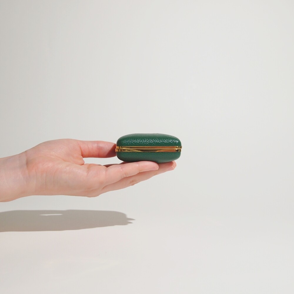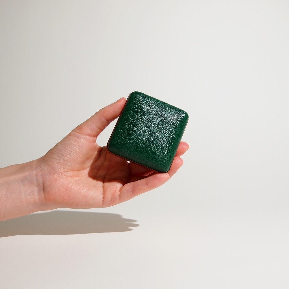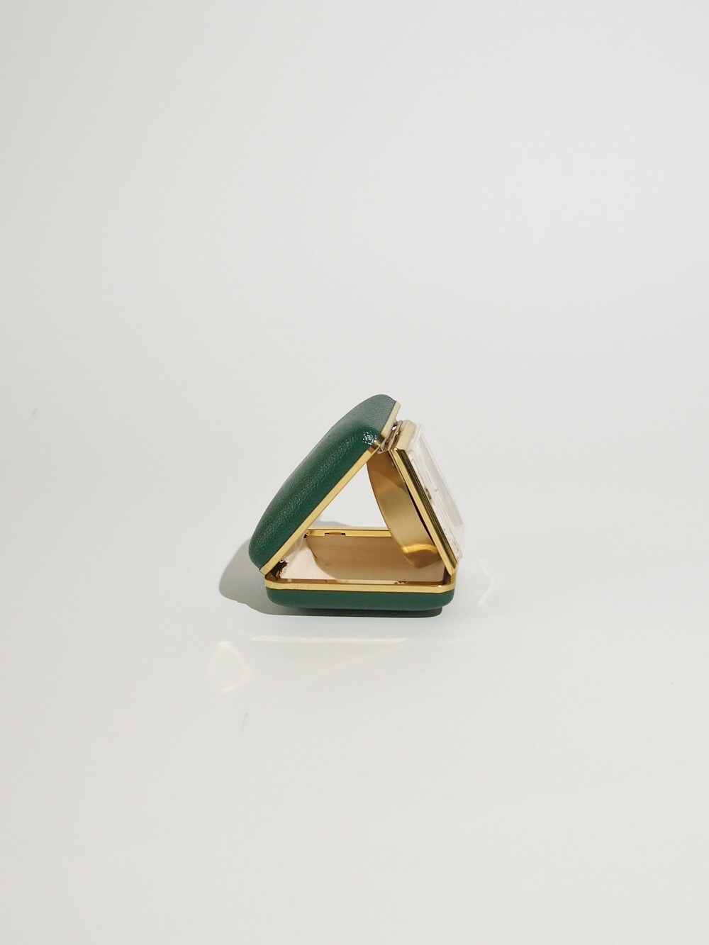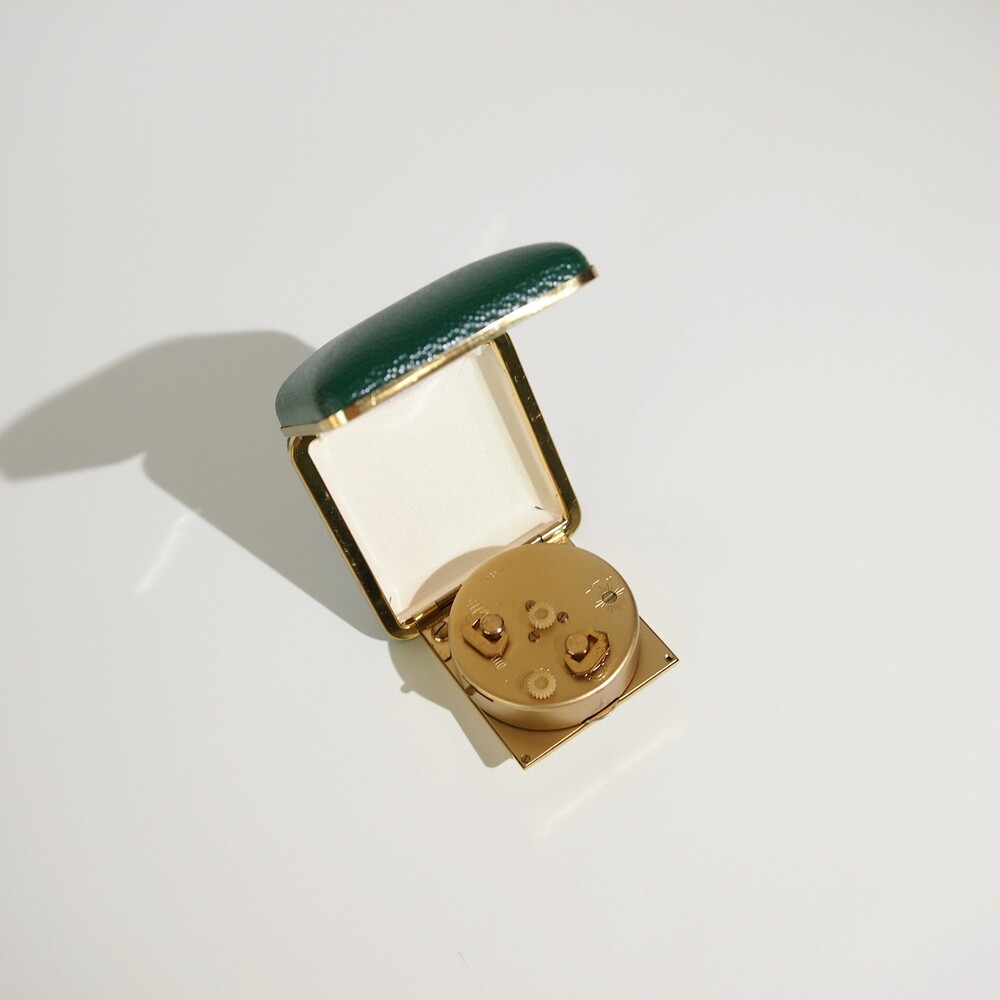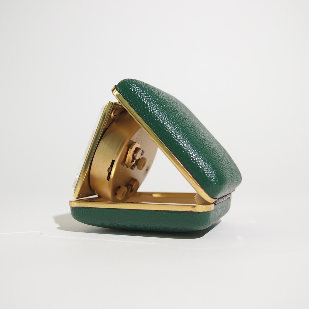 그린 컬러의 가죽 케이스, 화이트 바탕의 다이얼과 브라스 재질의 베젤로 디자인되어 있으며 태엽을 감아 사용하는 방식으로 최대로 감았을 경우 24~30시간을 유지합니다.